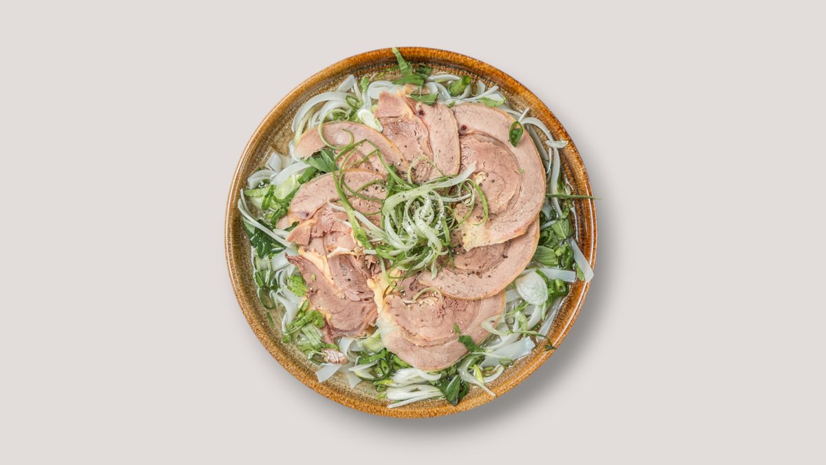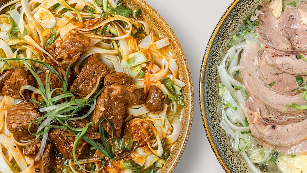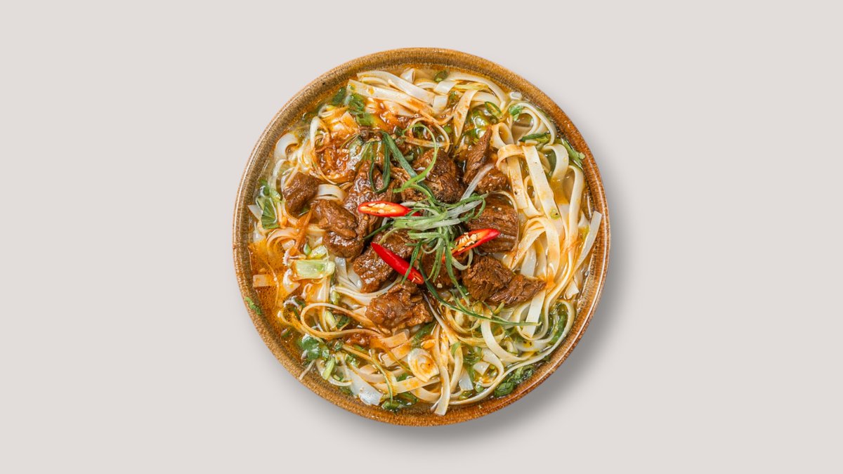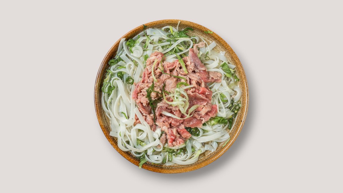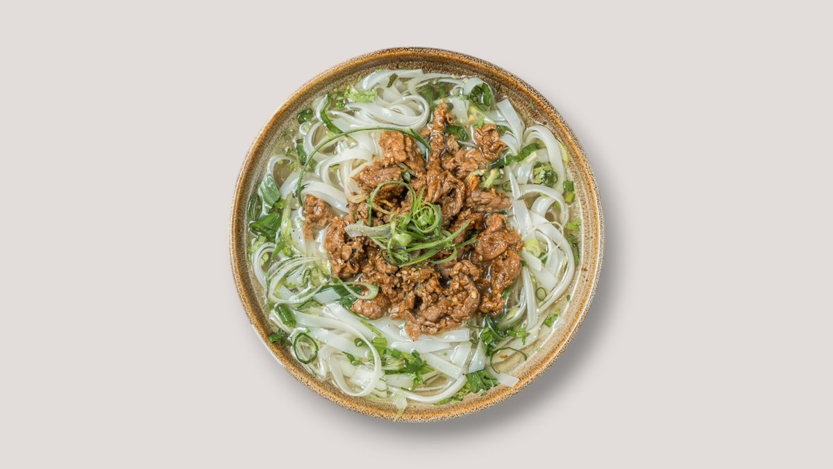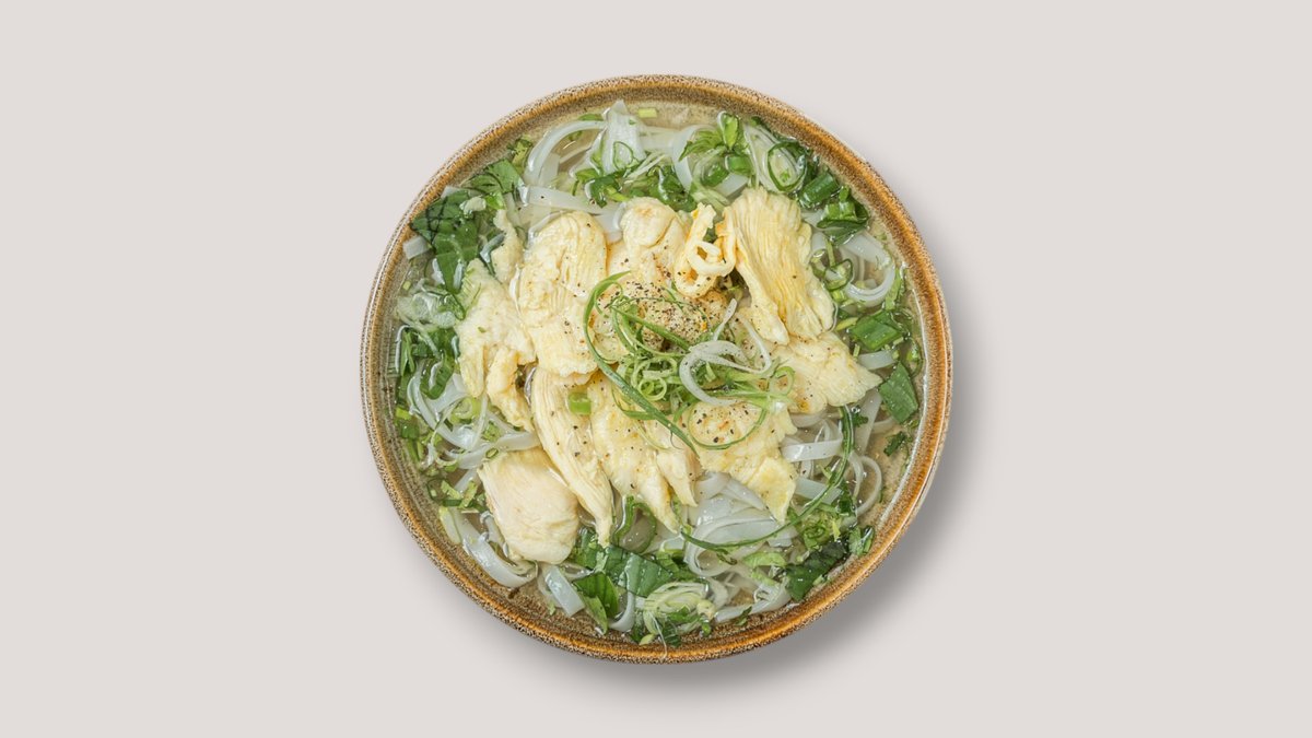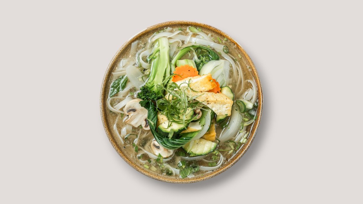 vietnamesische Reisbandnudelsuppe mit Tofu, Gemüse und frischen Kräutern