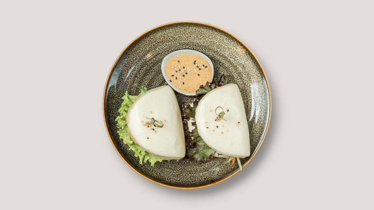 gedämpftes Hefebrötchen mit einem Soja-Patty, Salat, Gurken, Sesam und Sesamsoße