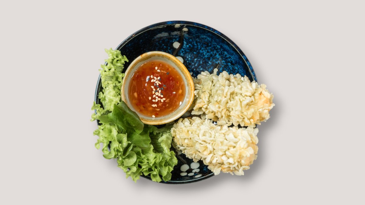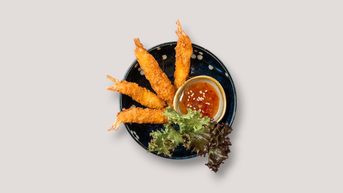 4 Stück knusprige gebackene Shrimps mit Süß-Sauer-Soße