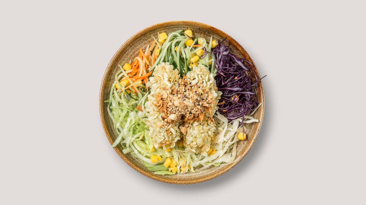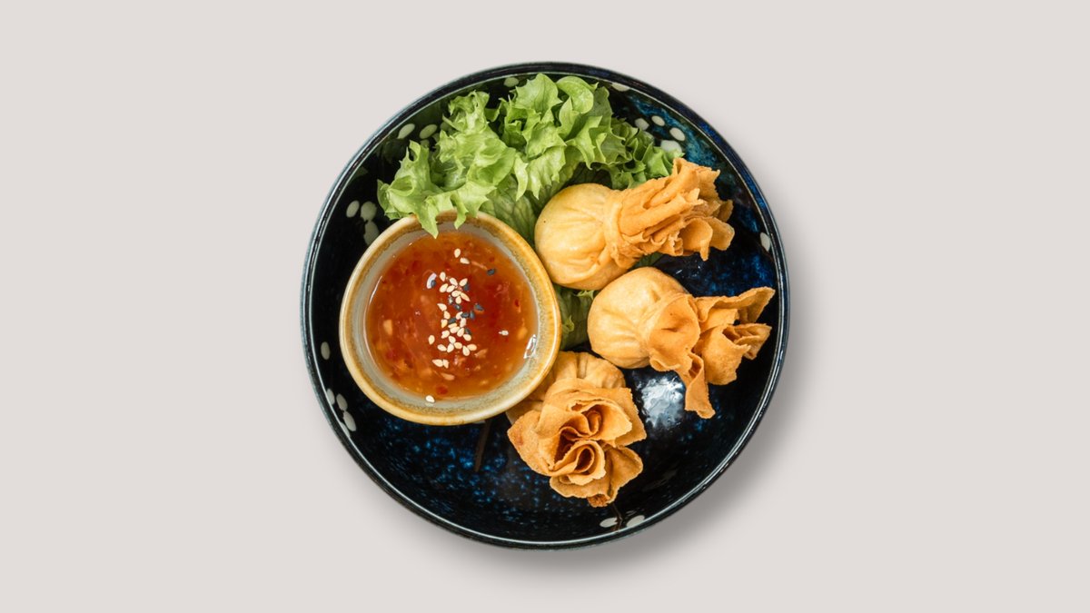 knusprige Teigtaschen, gefüllt mit Mungobohnen, weißem Mais, Zuckermais, Zwiebeln und Süß-Sauer-Soße