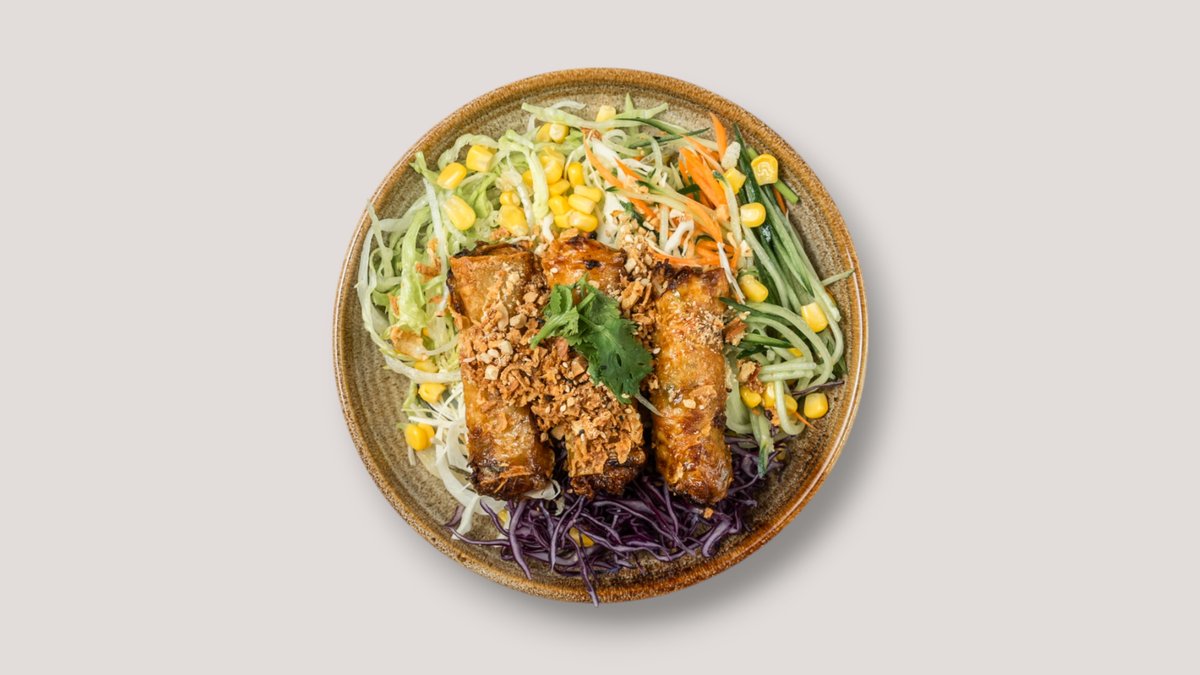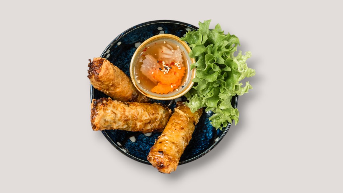 3 Stück knusprige Frühlingsrollen, gefüllt mit Hühnerfleisch, Gemüse und Süß-Sauer-Soße