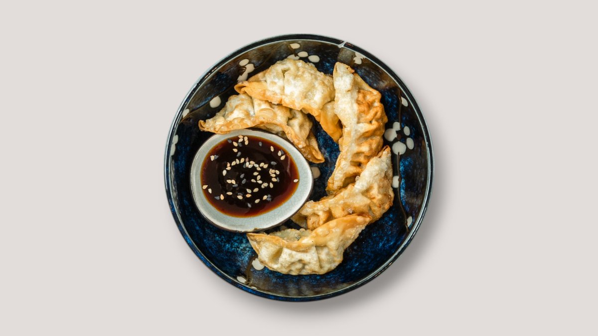 5 Stück gebratene Gyoza-Teigtaschen, gefüllt mit Gemüse und Unagi-Soße