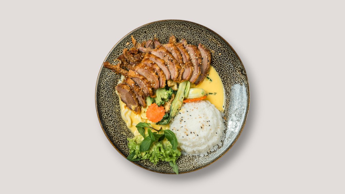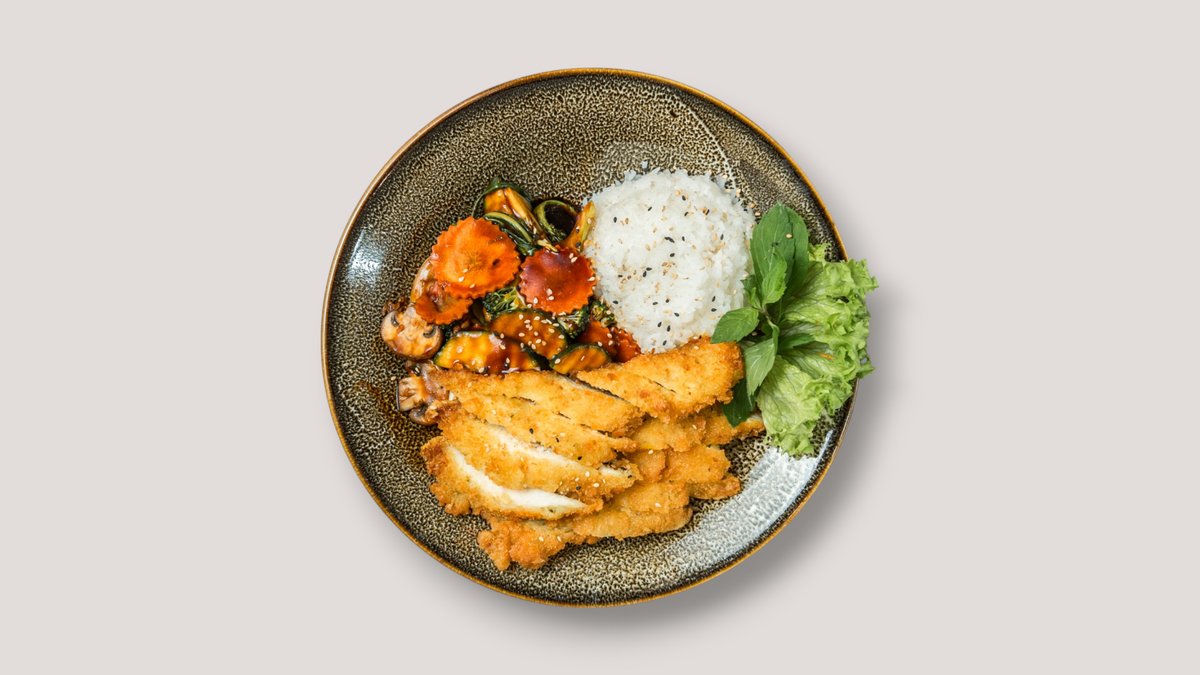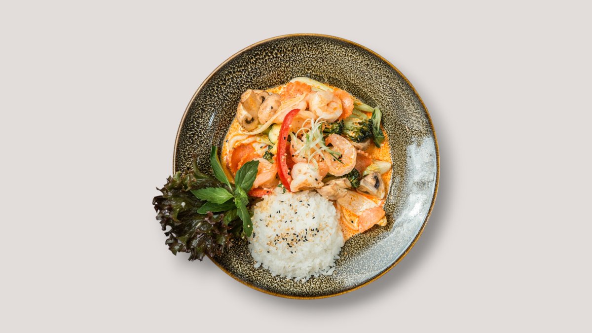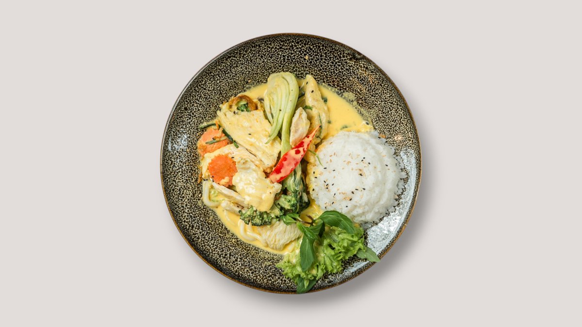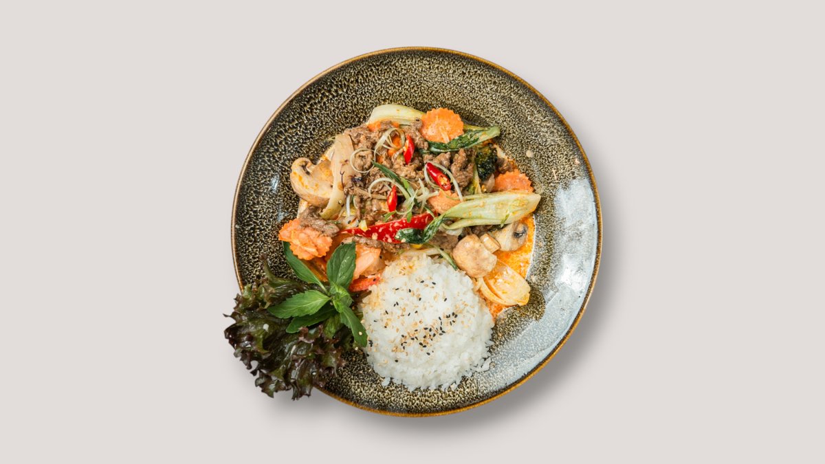 alle Gerichte werden mit verschiedenen Soßen, aromatischem Jasminreis, Karotten, Zwiebeln, Brokkoli, frischen Champignons, Zucchini und Sojasprossen zubereitet