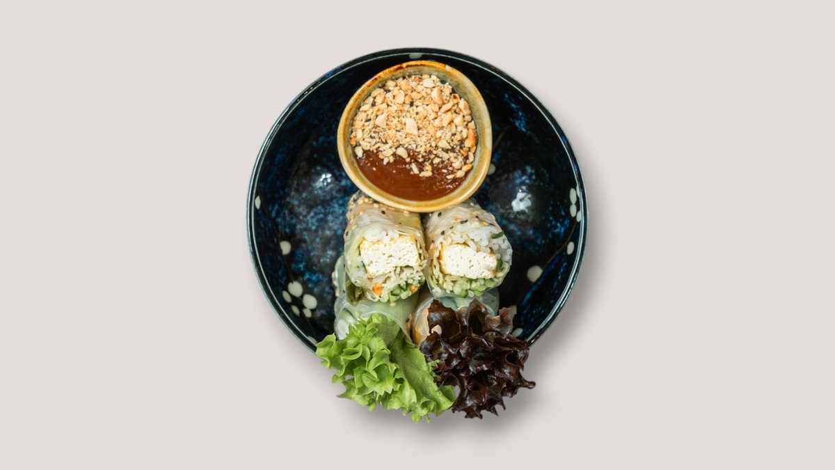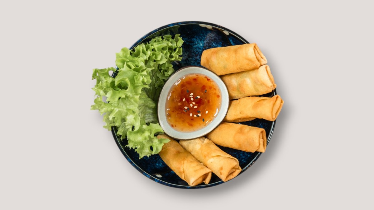 6 Stück knusprige Frühlingsrollen, gefüllt mit Gemüse und Süß-Sauer-Soße