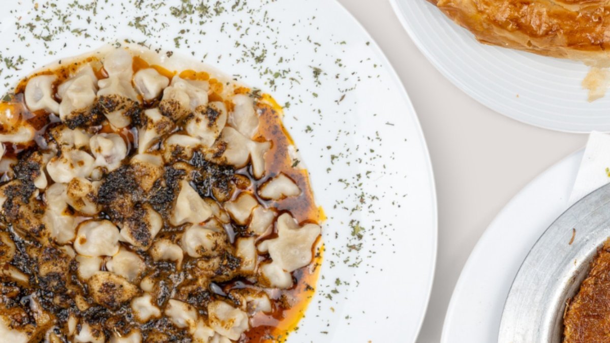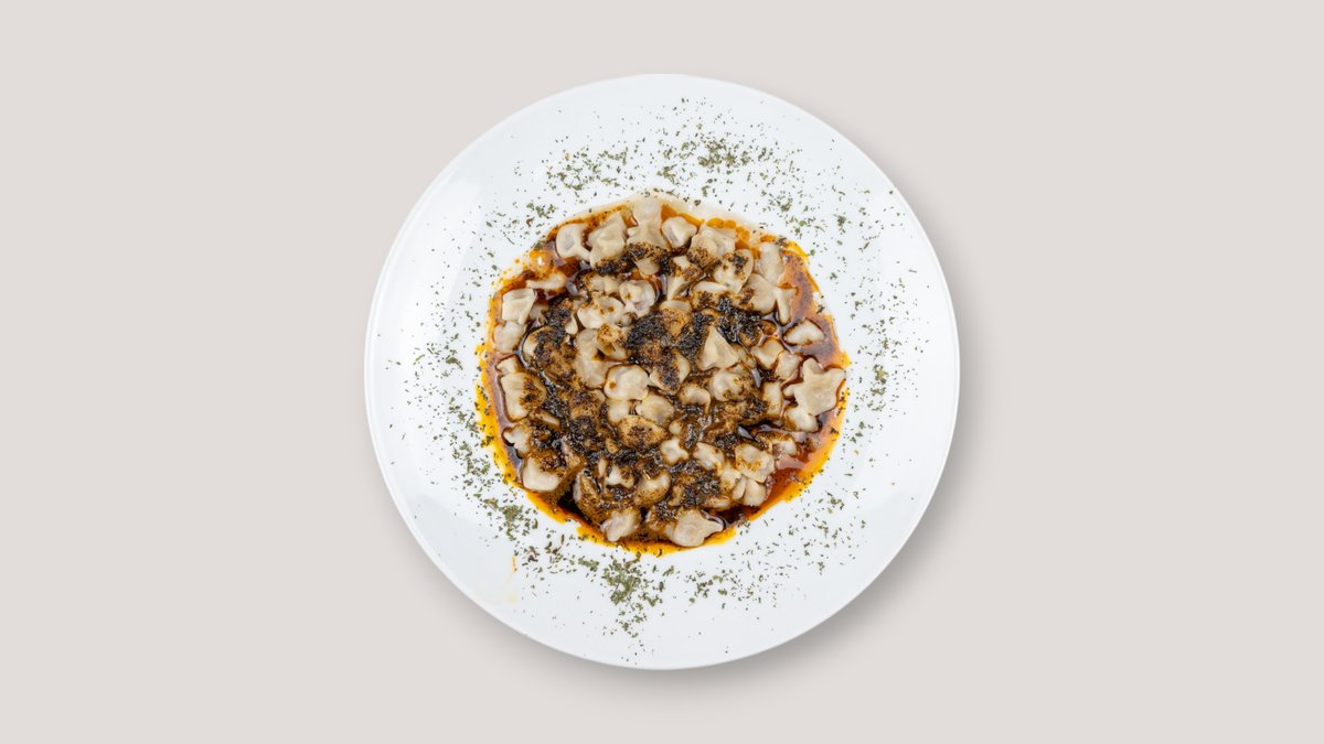 türkische Teigtaschen, gefüllt mit gewürztem Hackfleisch, serviert mit Joghurt-Knoblauchsoße und einer Paprikabutter