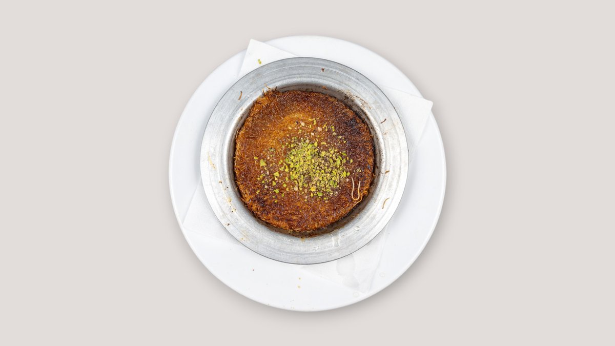 orientalisches Dessert mit einer knusprigen Fadenteigkruste, gefüllt mit Käse, warm serviert und mit Zuckersirup übergossen