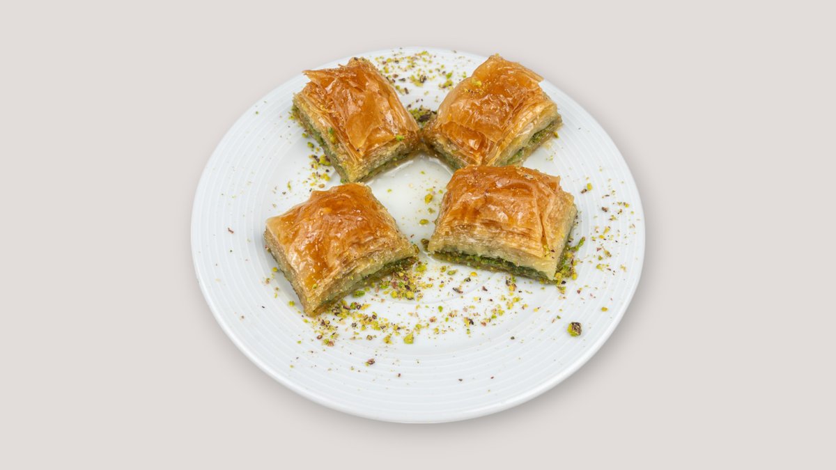 4 Stück feine Baklava-Rollen, gefüllt mit Pistazien und leicht gesüẞtem Sirup