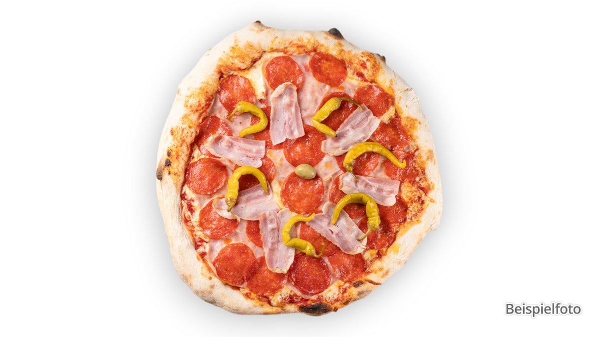 mit Salami, Schinken, Champignons, Peperoni, Paprika, Zwiebeln und Mozzarella