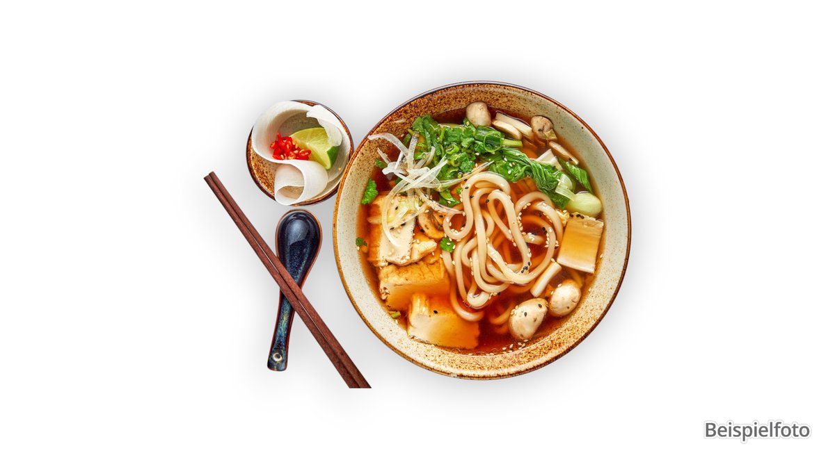 Reisbandnudelsuppe mit Garnelen, Schweinefleisch, Schalotten und Koriander