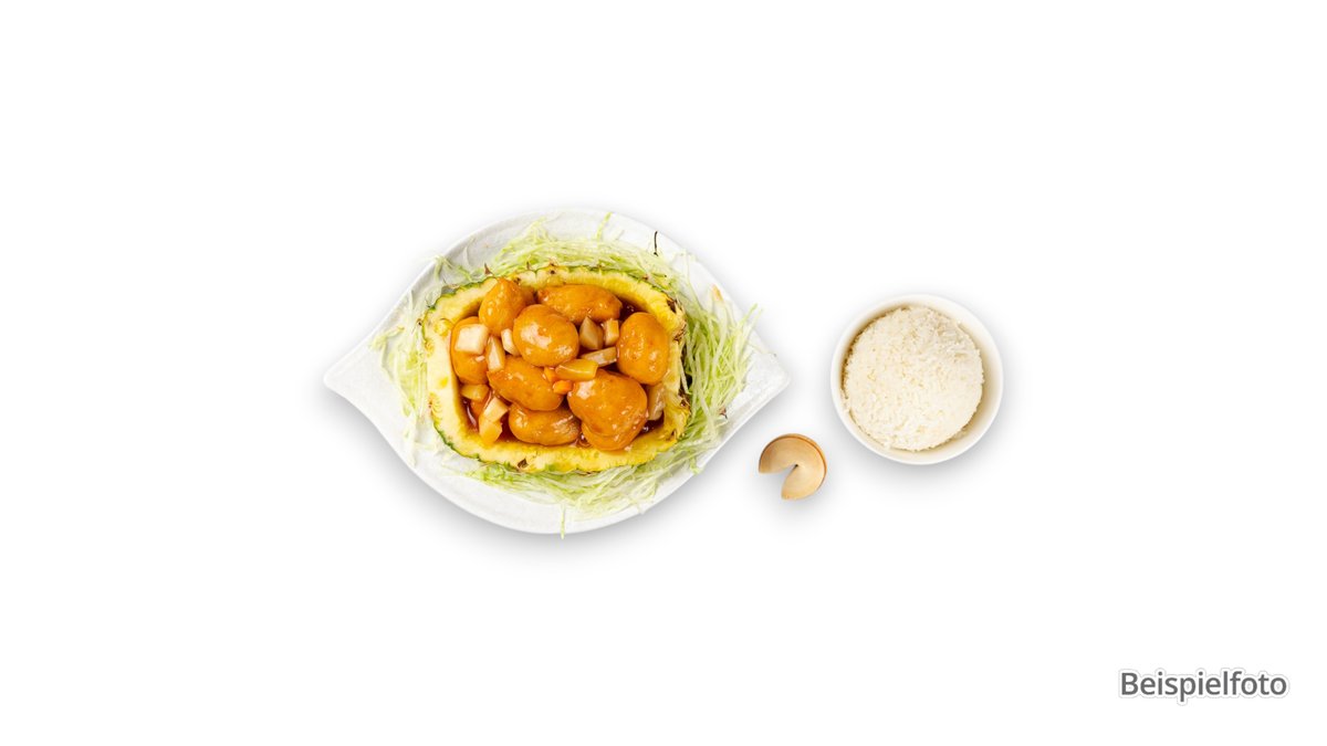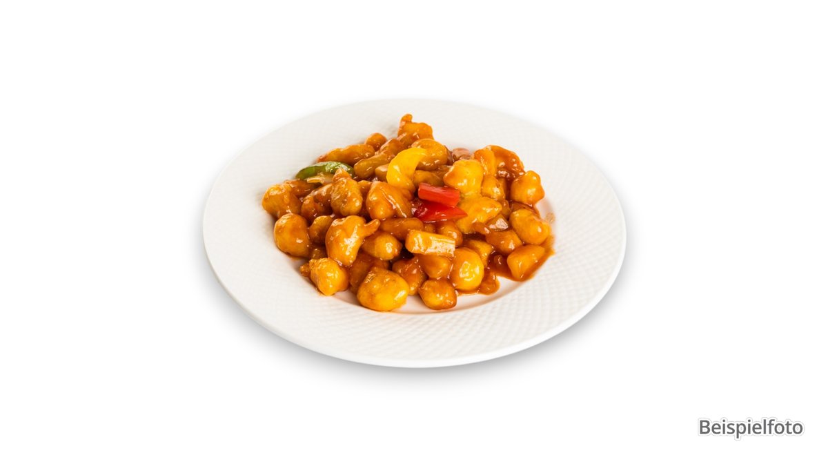 gebratenes Schweinefleisch mit Ananas, Sellerie, Gurken, Tomaten und Süß-Sauer pikant