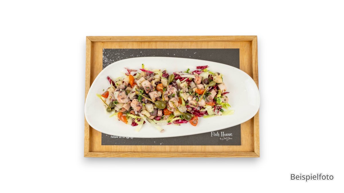 gebratenes Tintenfisch mit Ananas, Sellerie, Tomaten, Gurken und süß-sauer-scharf