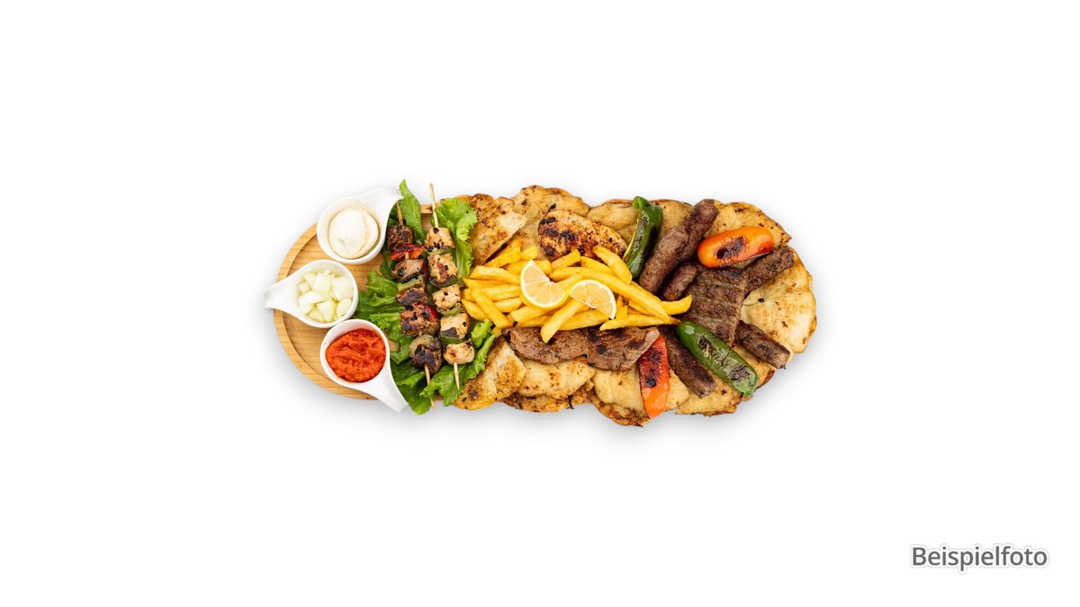 mit Rindfleischspießen gegrillt mit 5 speziellen Gewürzen, Hühnerspießen gegrillt mit Barbecue-Soße, Garnelenspießen gegrillt mit Curry, verfeinert mit Erdnuss, serviert mit Asia Kräutern und Tamarinde-Soße