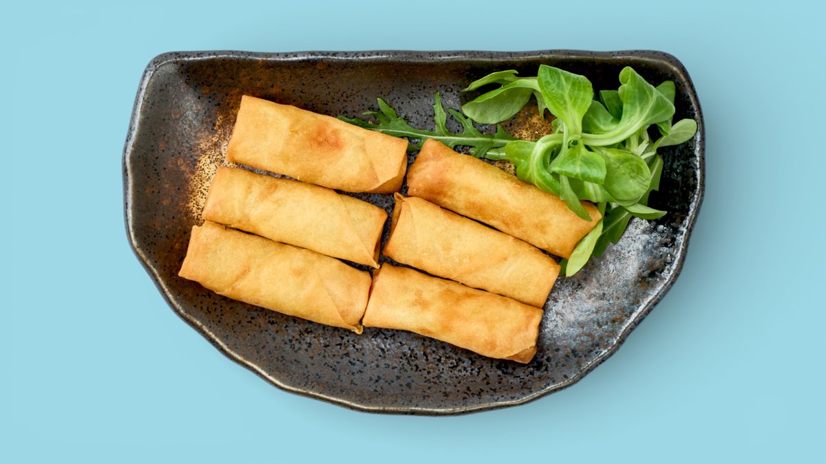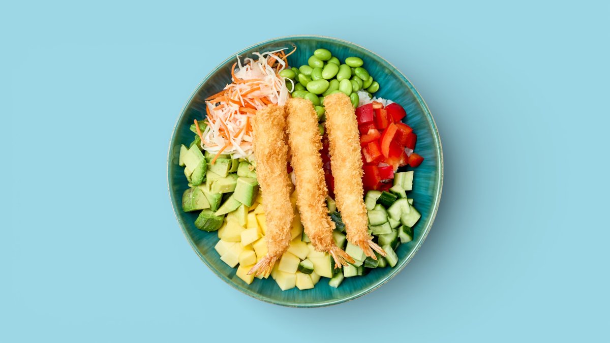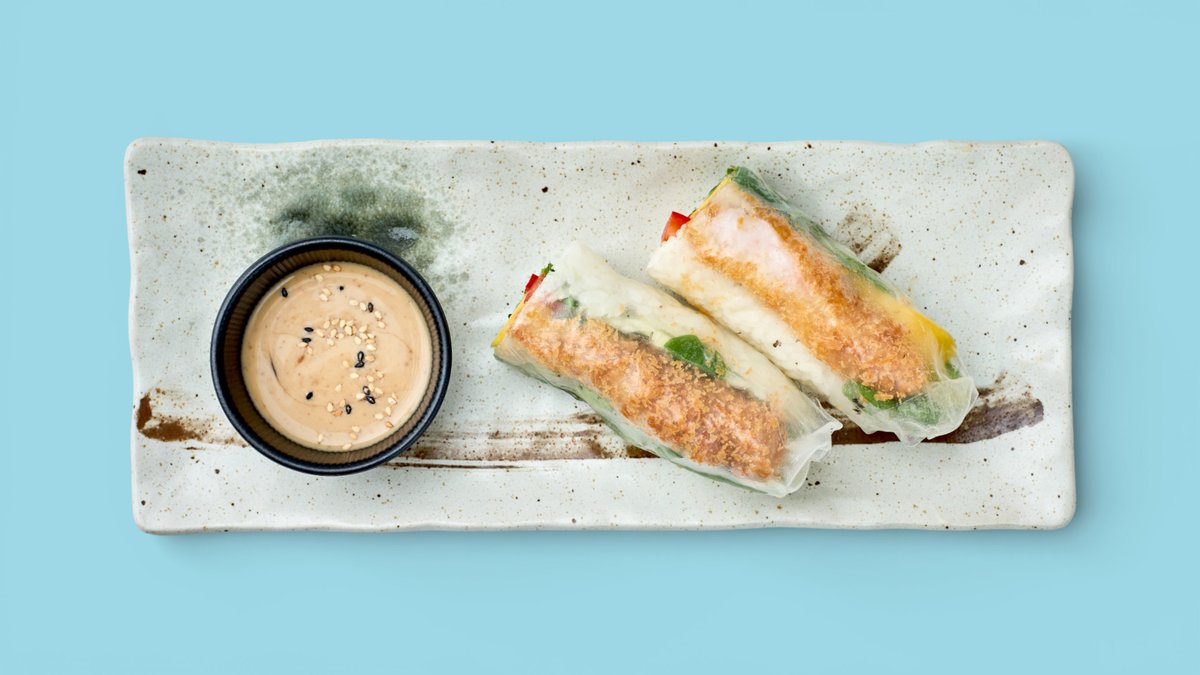 Reispapier, Eisbergsalat, Rucola, Gurken, Mango, Paprika, Reis, frittierten Garnele und Sesamsoße