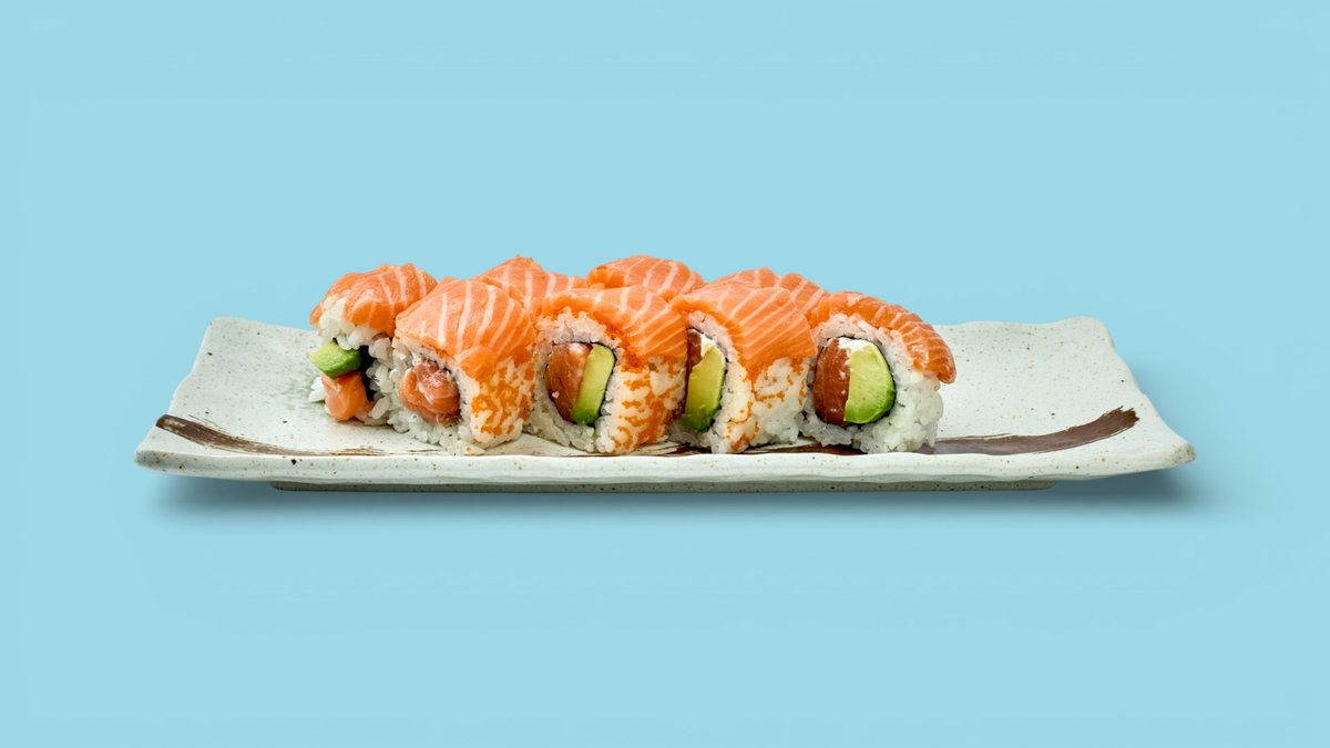Lachs, Avocado, Frischkäse, Masago, umwickelt mit Lachs