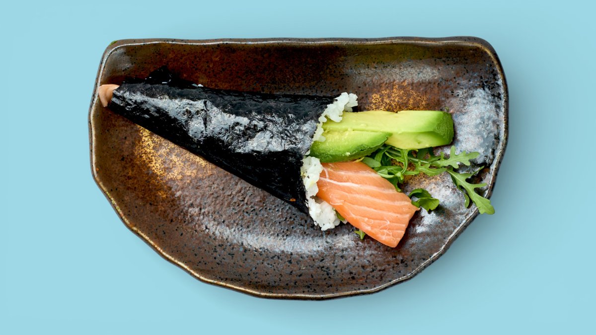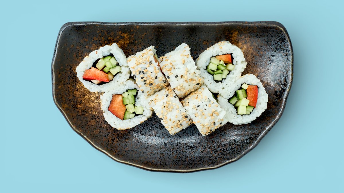 Surimi, Gurke, Avocado, Frischkäse, umwickelt mit Tofutasche.
