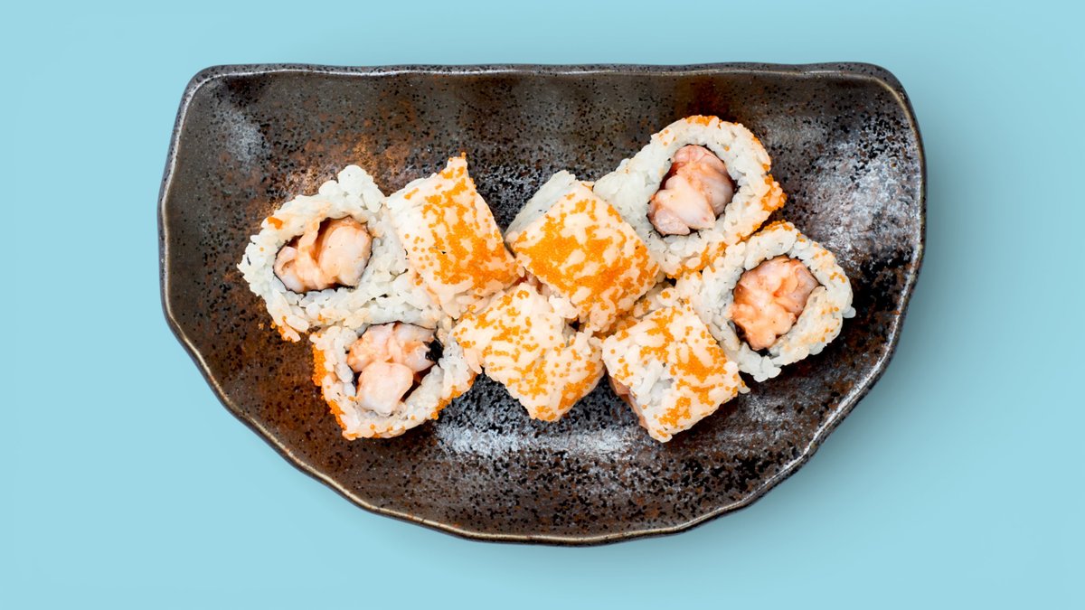 Mango, Rucola, Masago, Frischkäse, umwickelt mit Garnele