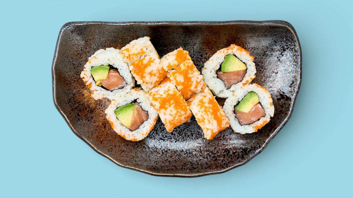 Mango, Avocado, Masago, Frischkäse, umwickelt mit flambiertem Lachs Enthält Alkohol, für Kinder und schwangere Frauen nicht geeignet