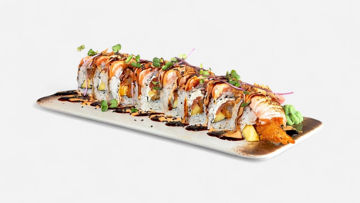mit gebackenen Garnelen, Räucherlachs, Mango, Cream Cheese und Röstzwiebeln - getoppt mit flambierten Lachs, Teriyaki-Soße, Spicy Mayonnaise und Kresse