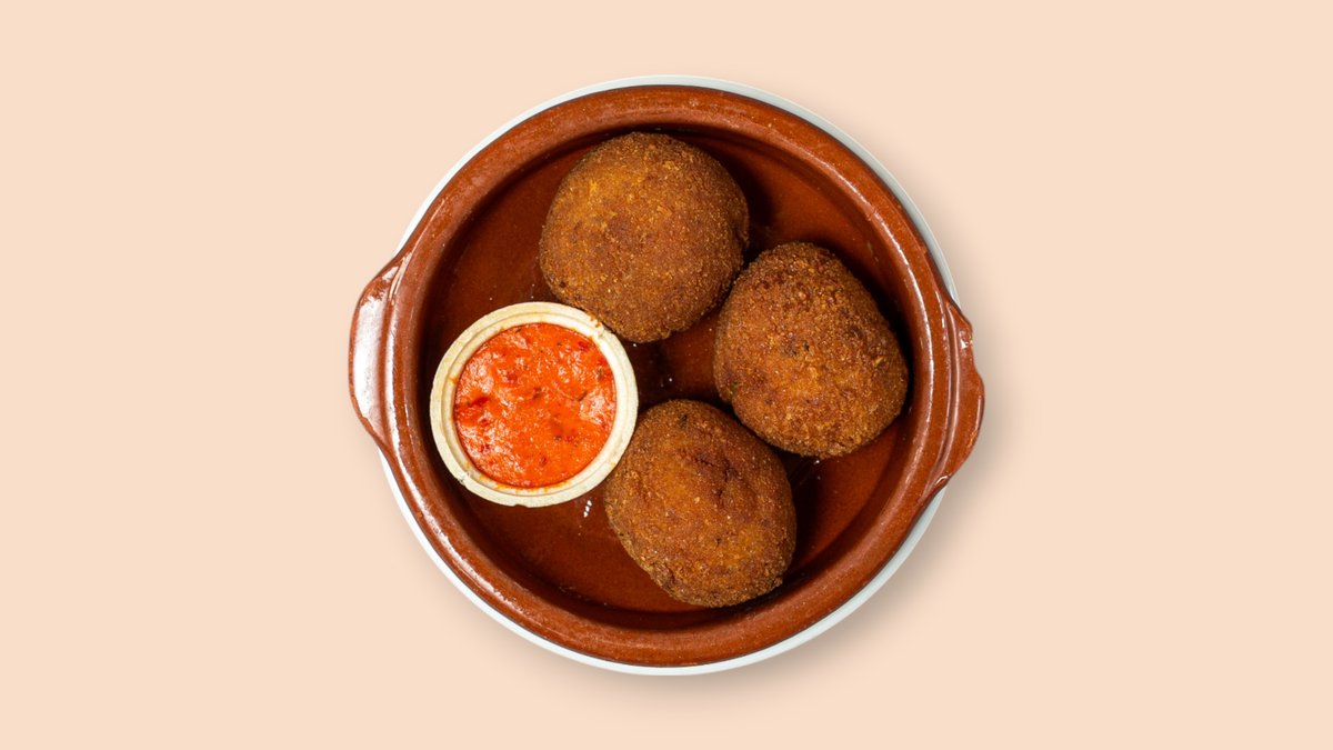 hausgemachte Kartoffelbällchen mit Serrano-Schinkenfüllung aus Schweinefleisch in Olivenbrotpanade und Mojo Rojo