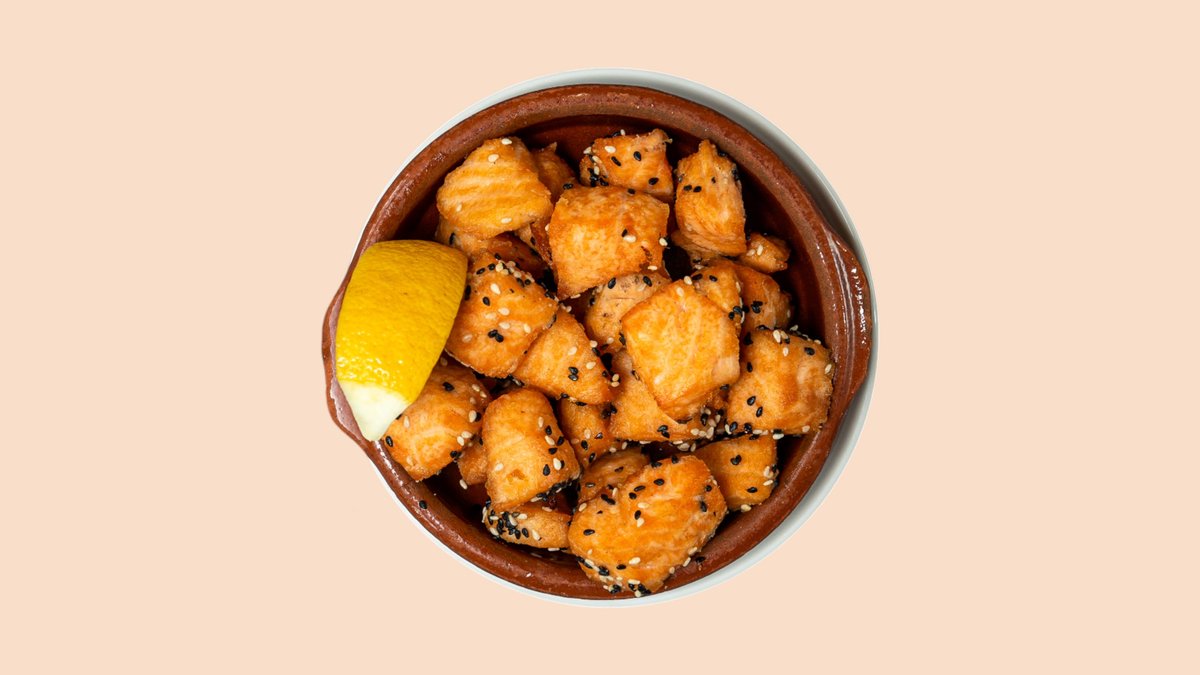 mit Lachswürfeln im Sesammantel, frittierten Seelachs-Happen mit Honig-Senf-Dip, marinierten Sardellen, spanischen Kartoffeln mit Rucola-Aioli und gemischten Oliven