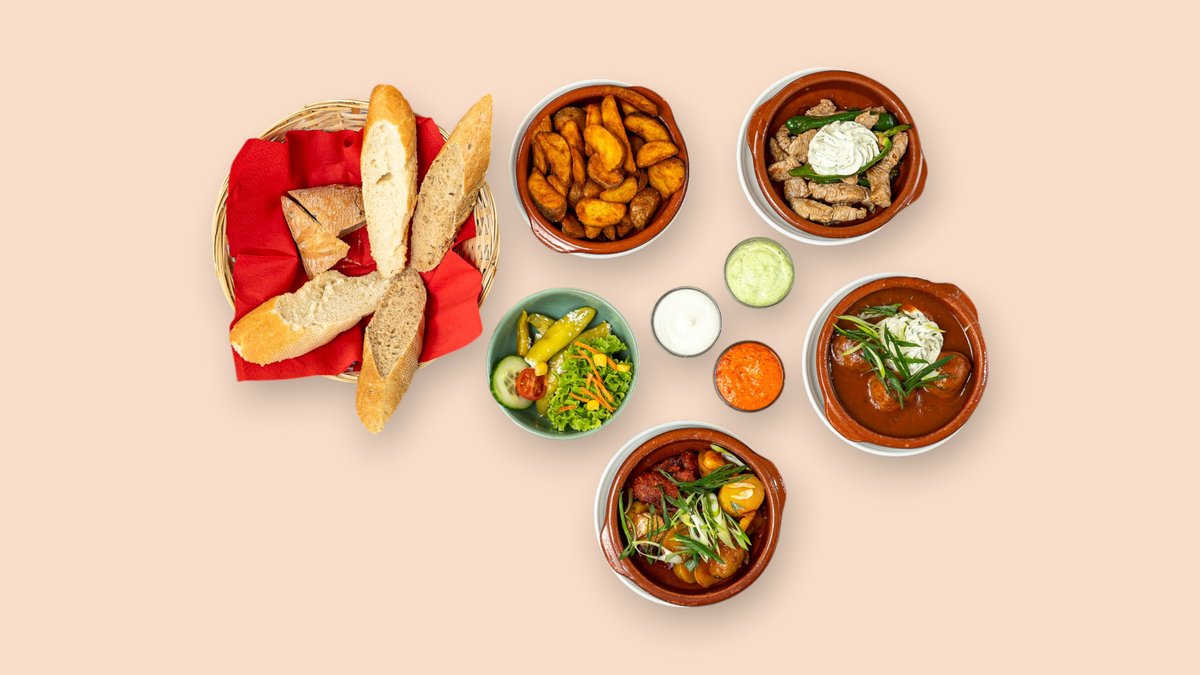 mit Schweinefleischbällchen in Tomatensoße, mit Frischkäse gefüllten Peperoni, Paprikawurst mit Kartoffelscheiben, Rindfleischstreifen mit Frischkäsedip und knusprigen Kartoffelecken mit Aioli