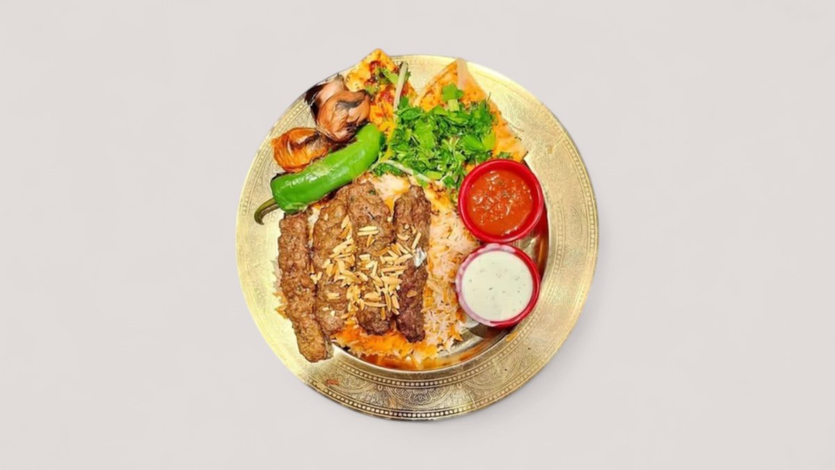 Genießen Sie Mandi Kebab - saftiger Lamm- und Kalbskebab, perfekt gegrillt, serviert mit Reis, Joghurt und scharfer Soße.