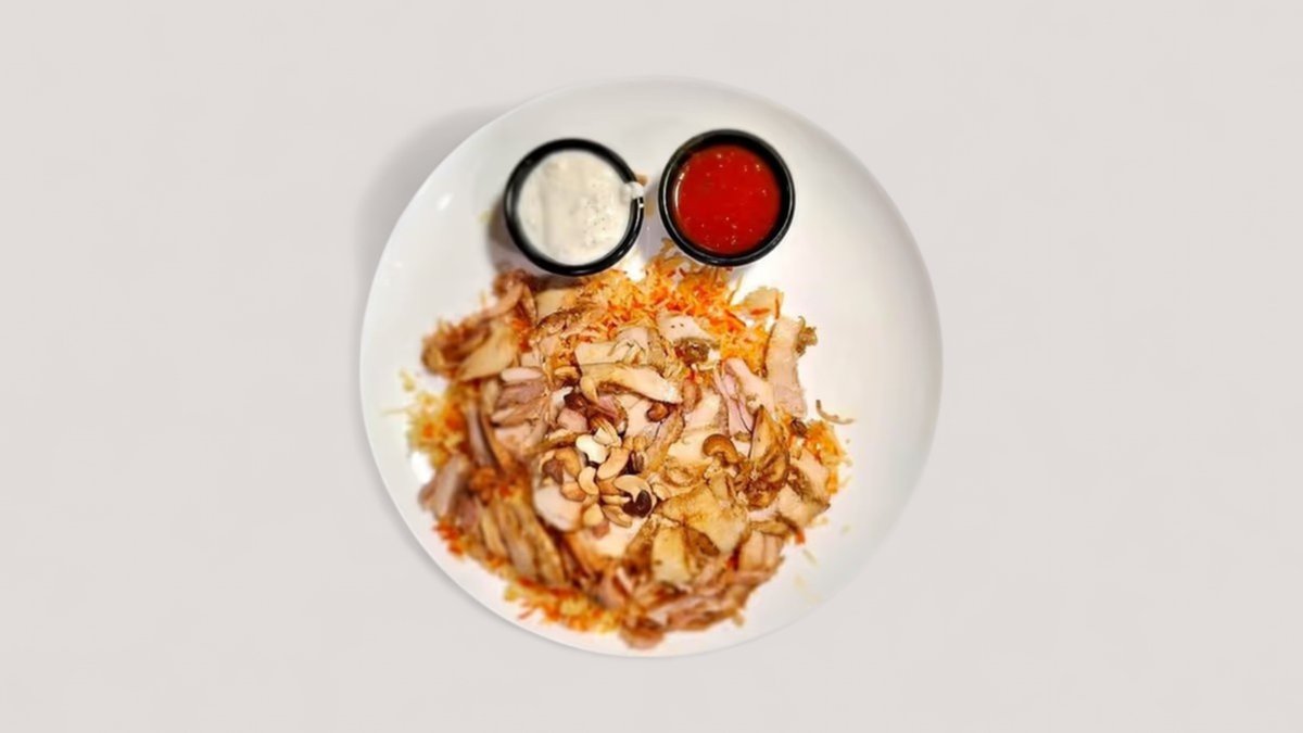 Genießen Sie Mandi Schawarma - ein köstliches Hähnchen-Shawarma mit Reis, serviert mit erfrischendem Joghurt und scharfer Soße.