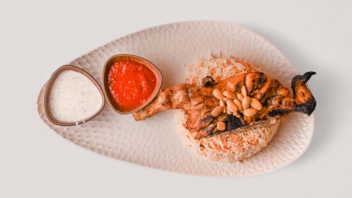 Genießen Sie Mandi Tavuk: saftige gegrillte Hähnchenbruststücke serviert mit Reis, Joghurt und scharfer Soße. Perfekt für Liebhaber scharfer Aromen.