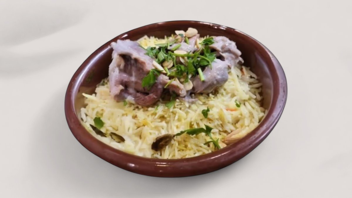 Genießen Sie unser tägliches Hauptgericht: Mandi Fleisch. Es besteht aus zartem Lammfleisch, serviert mit duftendem Reis.