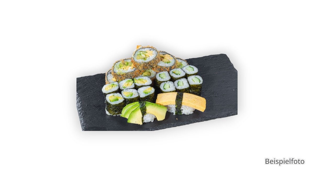 77 StĂĽck 5x Hosomaki: Kappa, Hocado, Hocola, Aparagut, Oshinko 2x Uramaki: Yasai, Parako 1x Futo Veggie 2x Spezial Rolle: Niku Nashi, Ayumi 1x Age Veggie 4x Nigiri: Tofu, 2 Avocado, Chuka Seetang