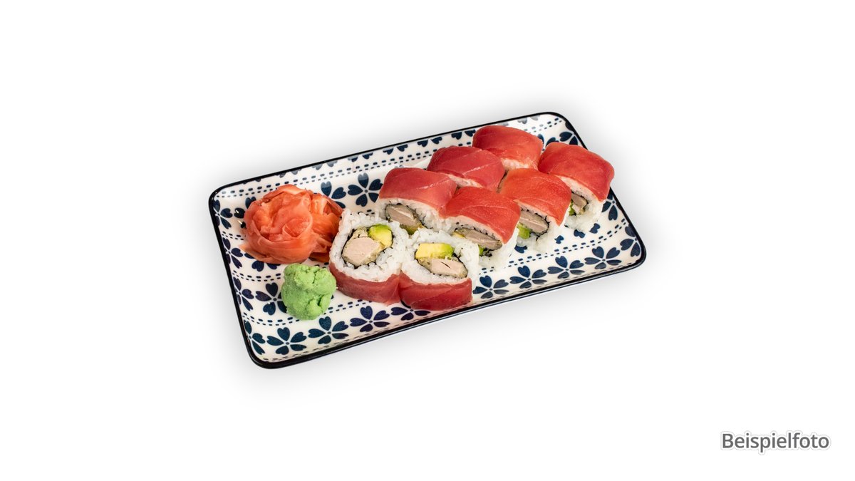 78 StĂĽck 4x Hosomaki: Hosake, Tekka, Hocado, Suricado 2x Uramaki: Yasai, Kawa 2x Spezial Rolle: Tora, Ayumi 2x knusprige Rolle: Age Salmon, Age Veggie 4x Nigiri: Lachs, Thunfisch, Garnele, Avocado 1x Sashimi Tuna Sake