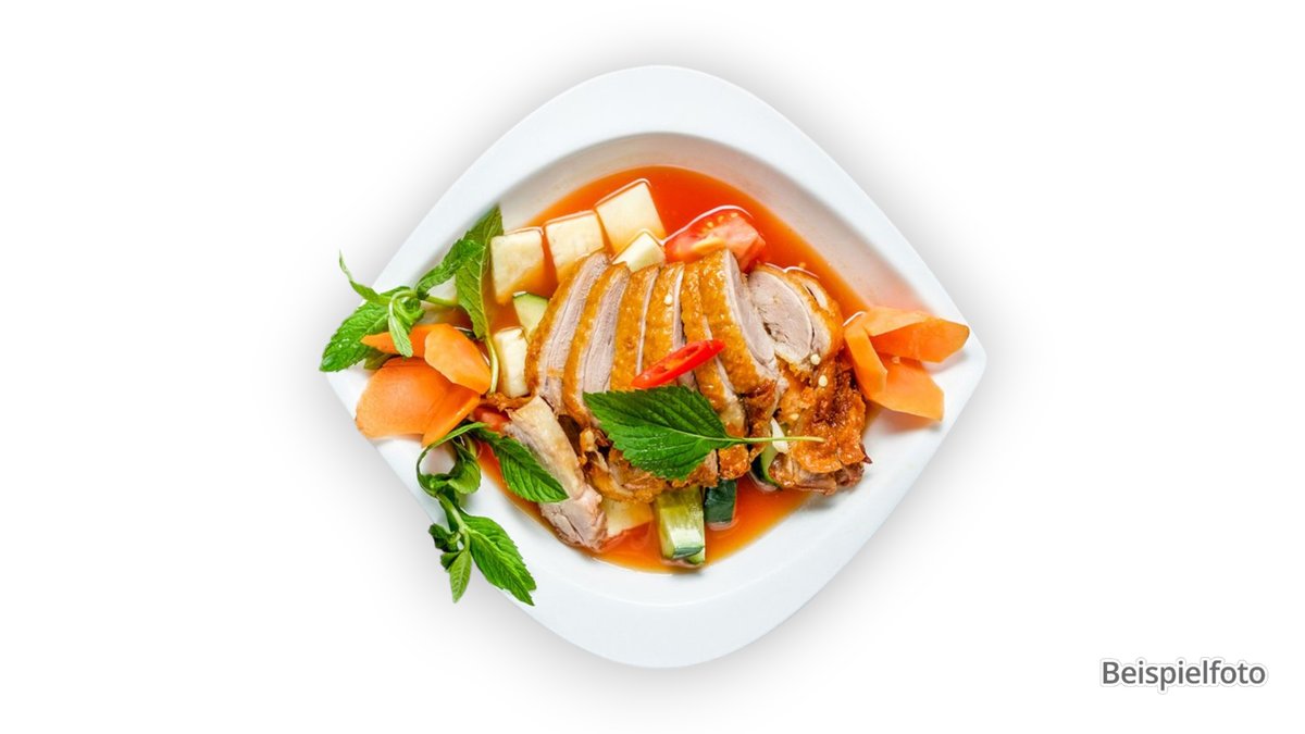mit knuspriger Ente, GemĂĽse und Champignons in Erdnuss-SoĂźe