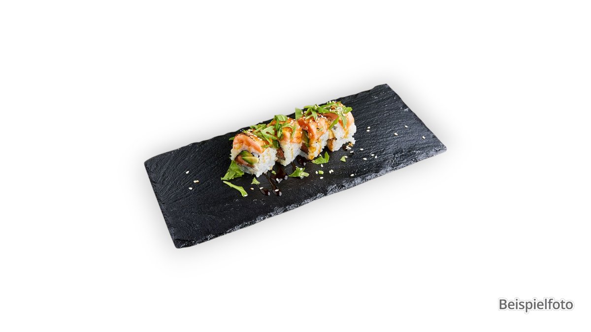 mIt Teriyaki-Soße, Mayonnaise, Lachs, gebratenen Garnelen, Frischkäse, Mango, Rettichsprossen und Sesam