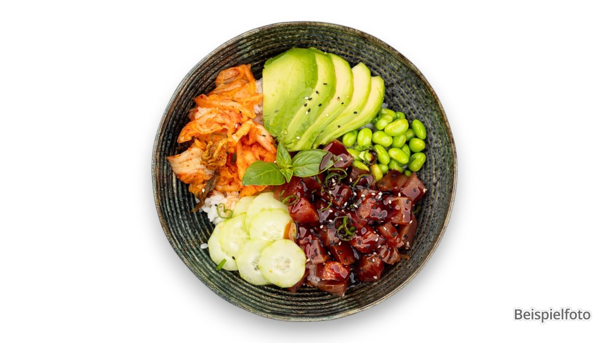 mit Thunfisch, Avocado, Gurken, Mango, Seetangsalat, Salat, Flugfischrogen und scharfer Mayonnaise