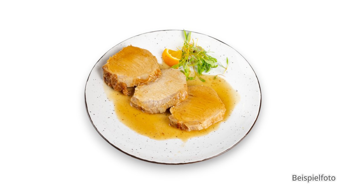 mit gebratenem Schweinefleisch, GemĂĽse und Champignons in Teriyki-SoĂźe