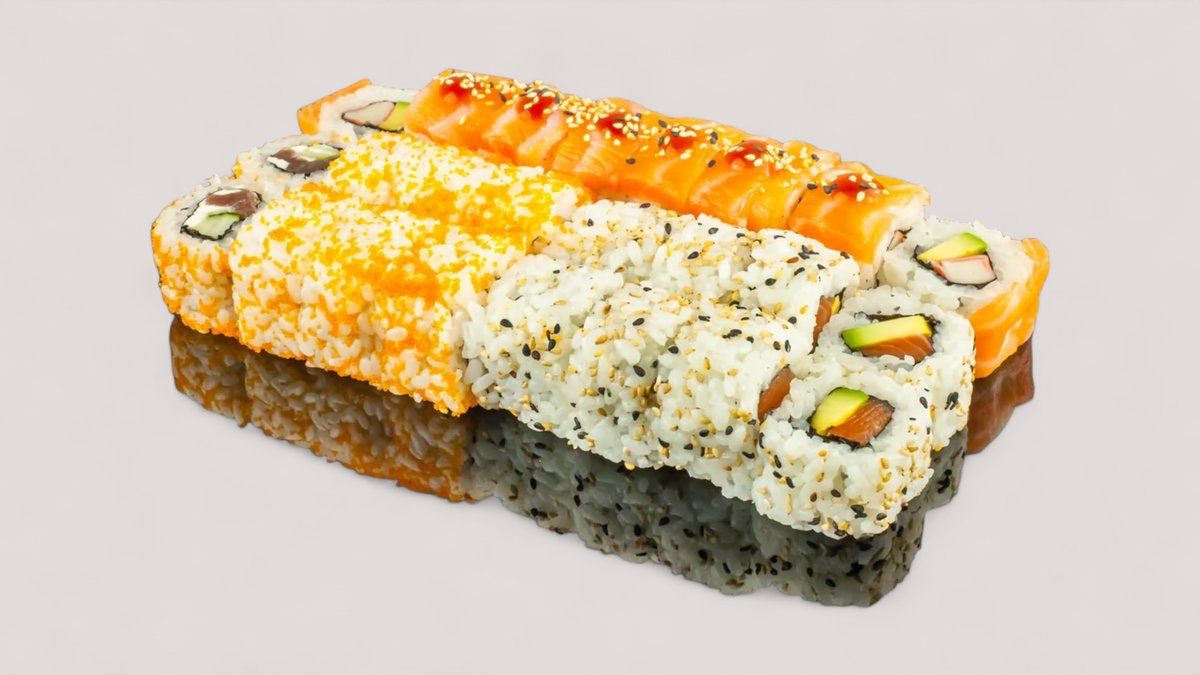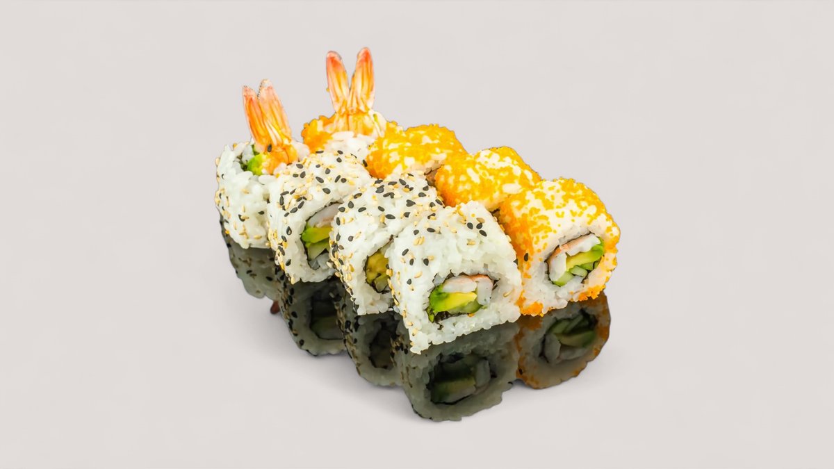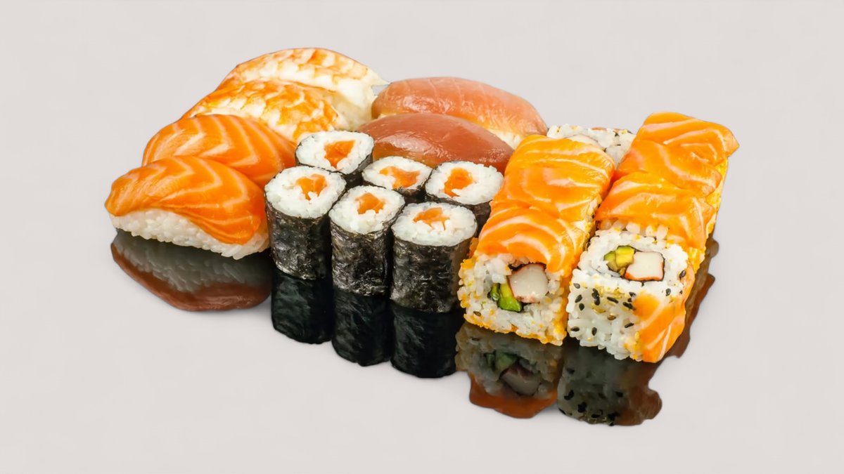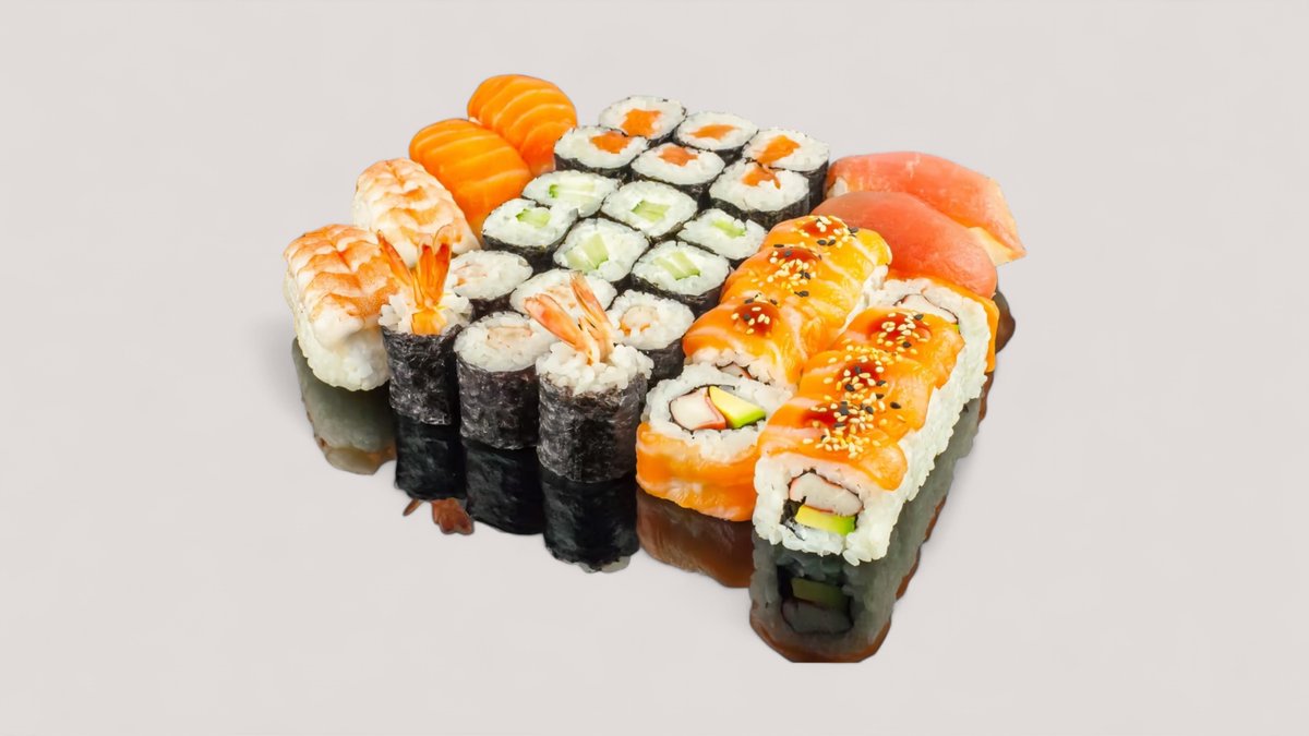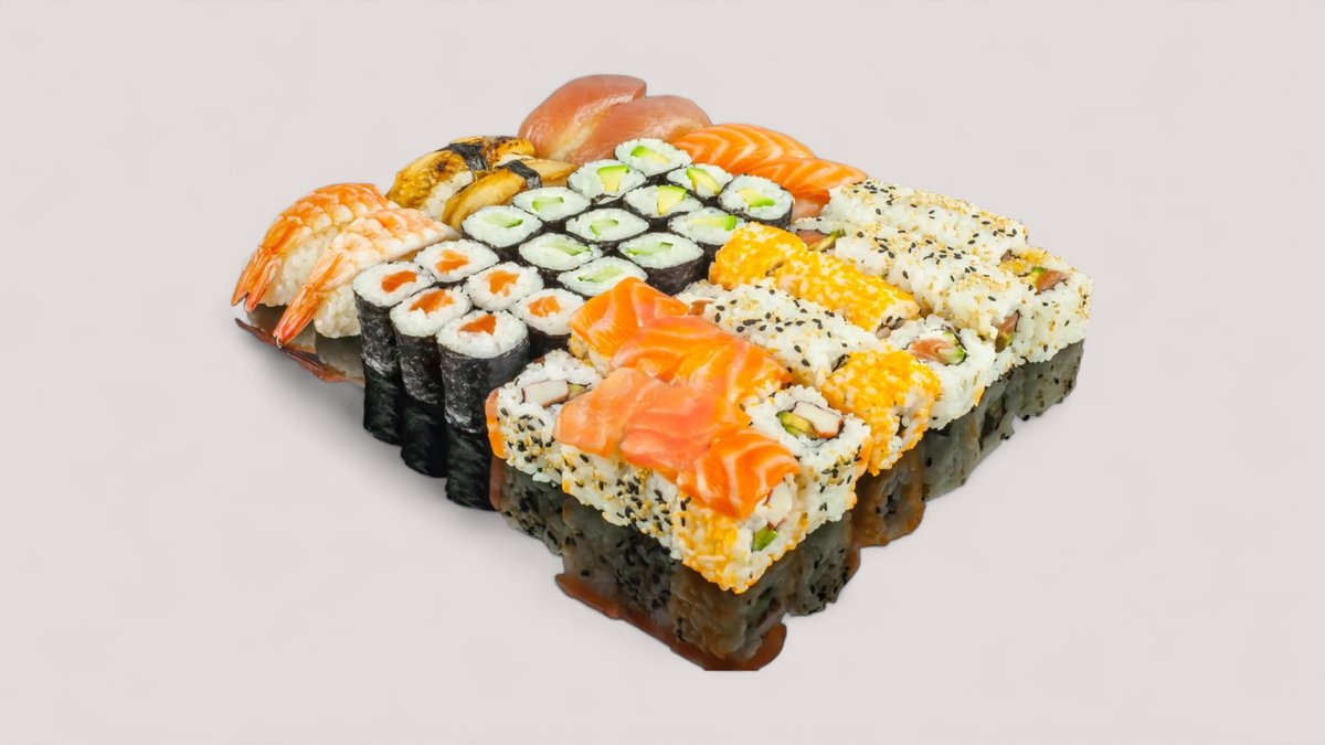 8x California Rolls mit Lachsmantel 8x Alaska Rolls mit Sesam 8x Philadelphia Rolls mit Masago 6x Maki Sake 6x Maki Kappa 6x Maki Avocado 2x Nigiri Sake 2x Nigiri Maguro 2x Nigiri Unagi 2x Nigiri Ebi