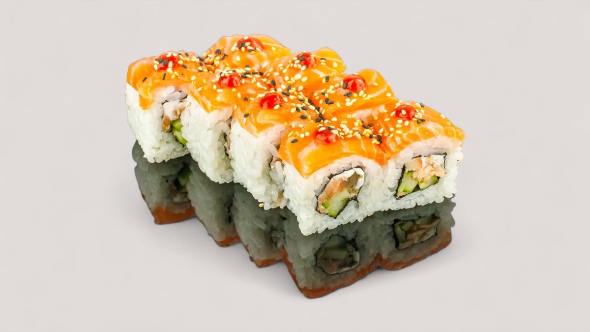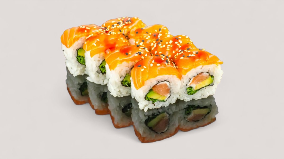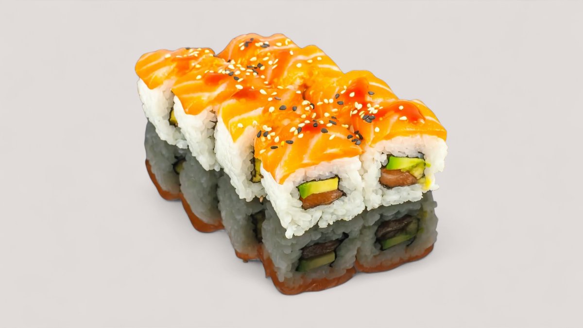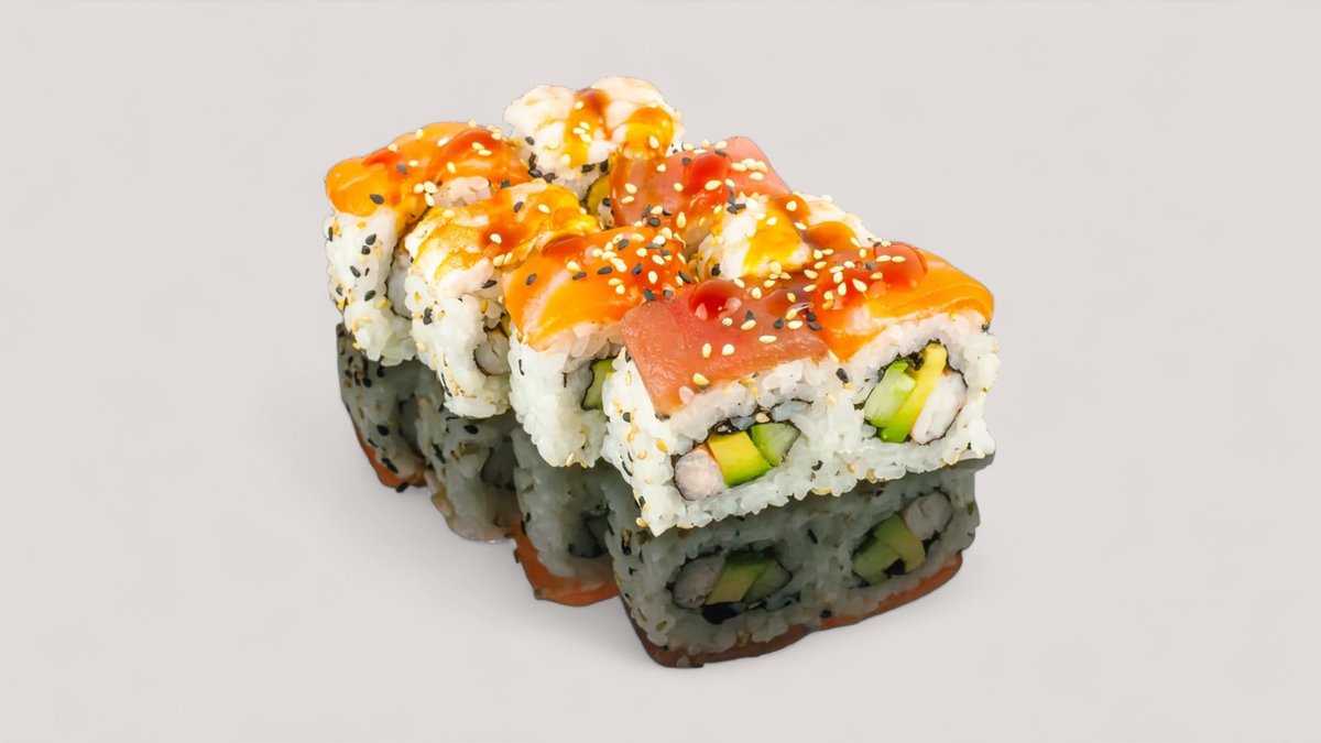 mit Lachs, Avocado, Surimi, Cocktail-Mayonnaise und Unagi obendrauf