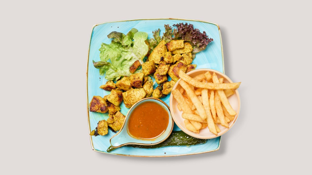 mit Rind, Hähnchen, Salat und einer Beilage deiner Wahl serviert