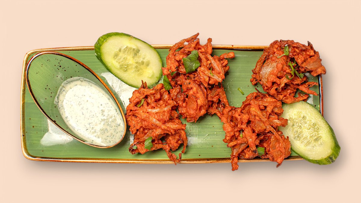 gewürzte, mit Mehl gebratenen Zwiebelringen, serviert mit Minze-Chutney