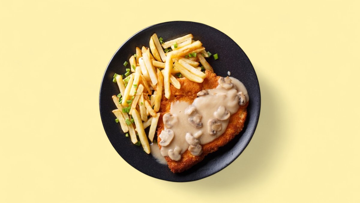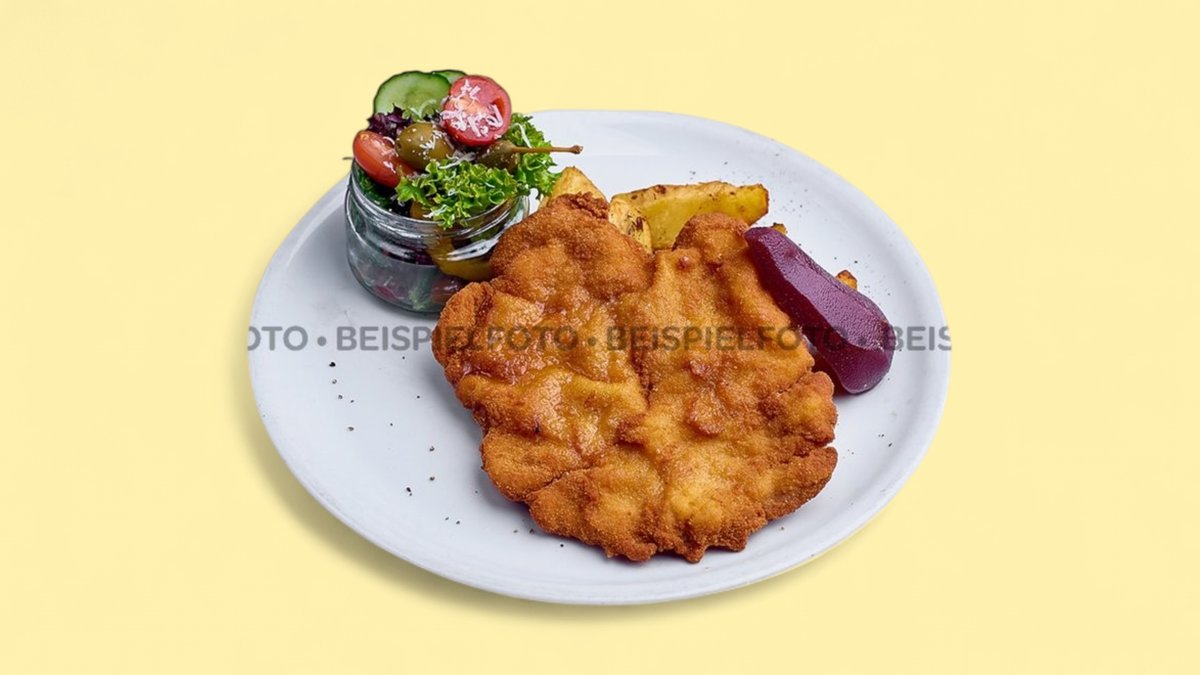 alle Schnitzel werden mit Pommes frites und Beilagensalat serviert