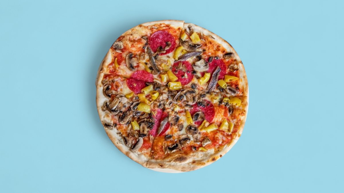 mit mit grünen Peperoni, Peperoniwurst, Zwiebeln und Oliven