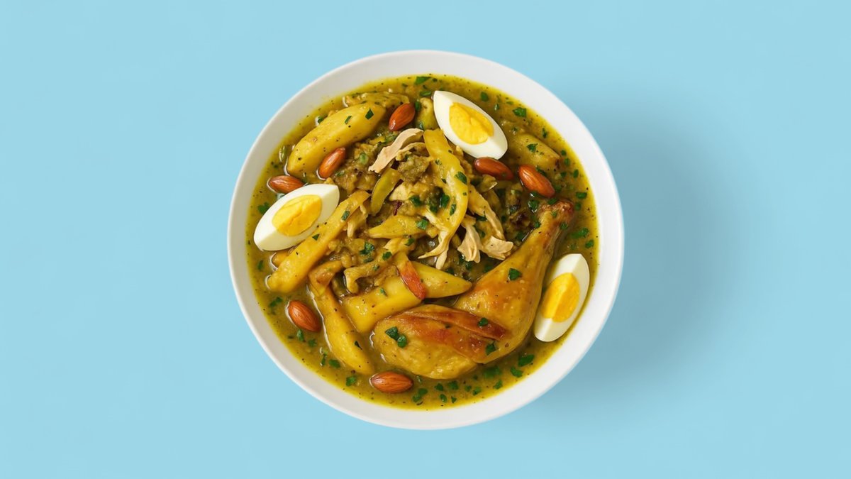 mit Hähnchen, Ingwer, Safransoße, Mandeln und Ei