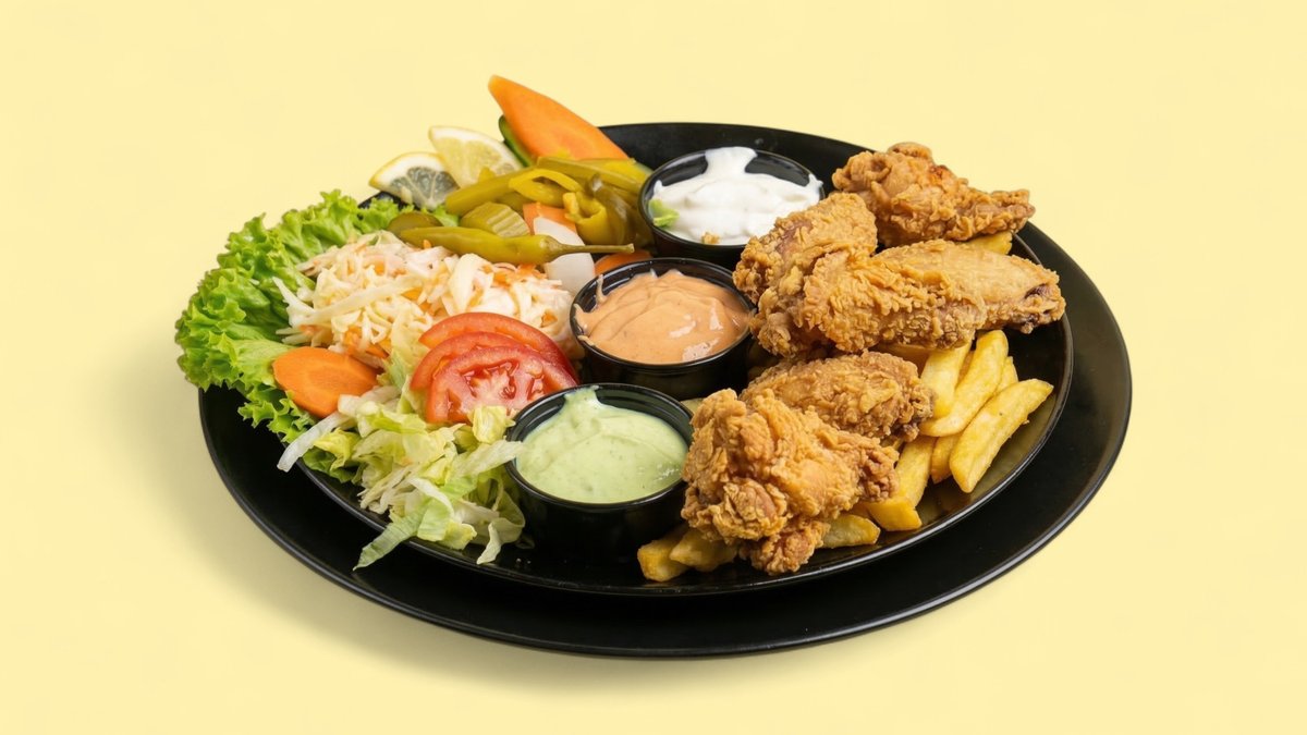 mit 6 Stück knuspriges Chicken Wings, Krautsalat, Pommes frites und Knoblauchsoße
