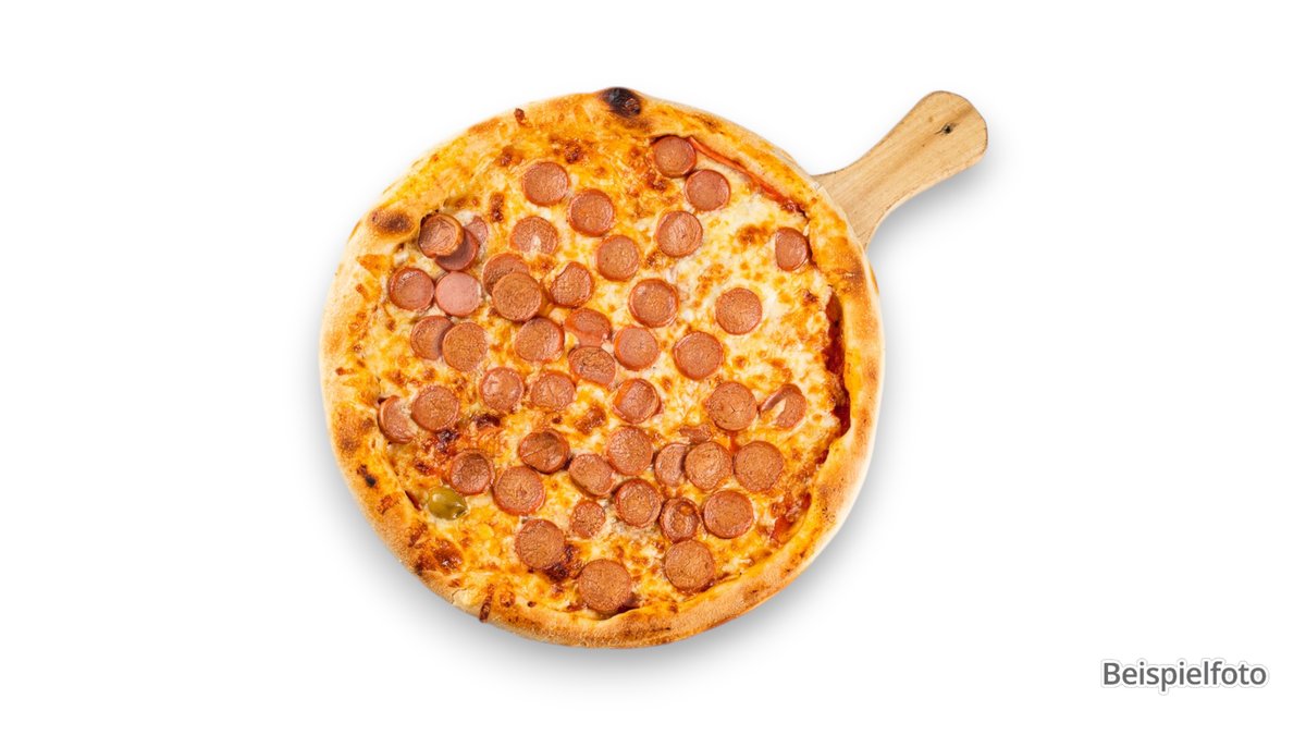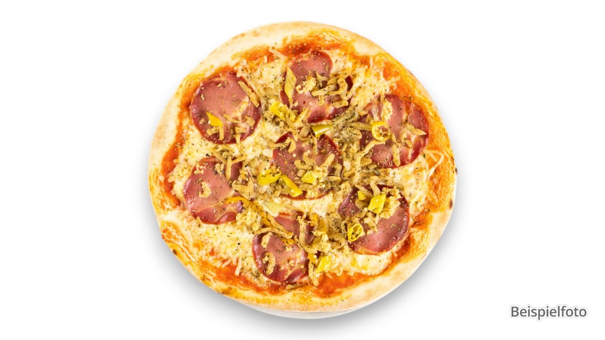 mit Tomatensoße, Käse, Salami vom Rind, Schinken von Pute, Champignons, Peperoni, Zwiebeln und Oliven