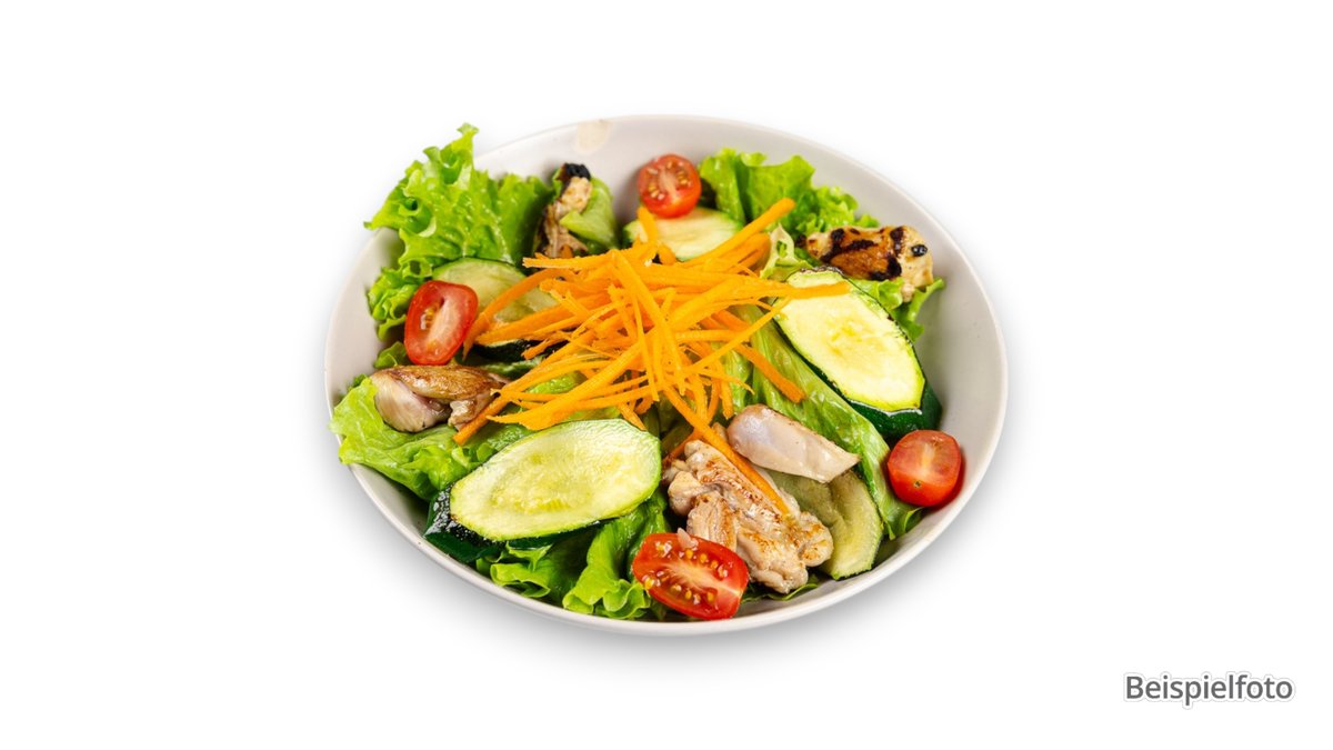 mit gegrilltem Hähnchen, Paprika, roten Zwiebeln, Möhren, Soyasoße und Nudeln