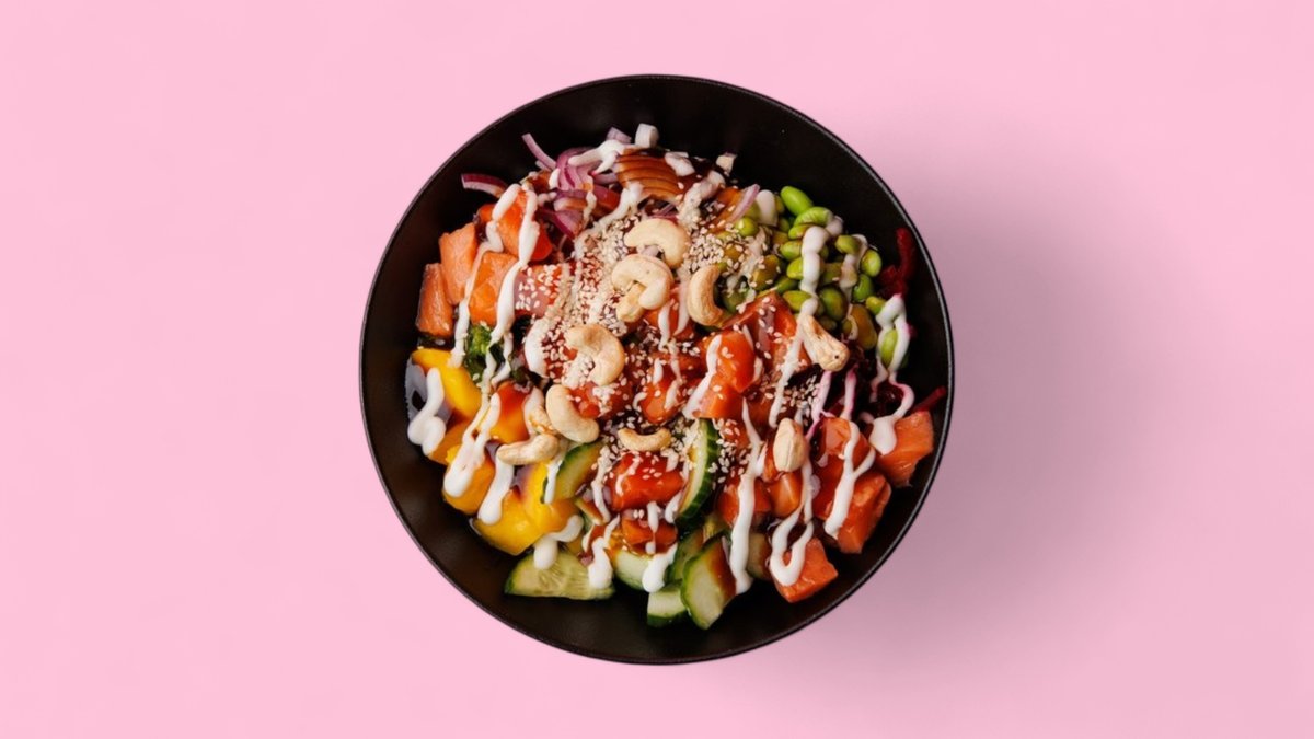 mit Mango, Gurken, roten Zwiebeln, Wakame, Rote Beete, Lachswürfeln, Teriyaki-Soße, Bedda-Mayonnaise, Sesam und Cashewnüssen