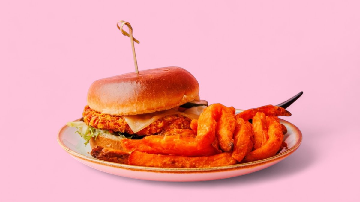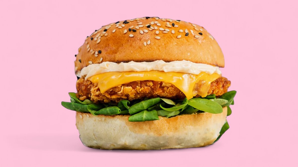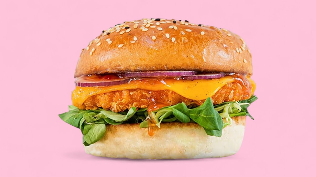 „Pans Crunchy Chik'n Burger” wird ohne veganem Cheddar, roten Zwiebeln und einem Burger-Brötchen deiner Wahl zubereitet