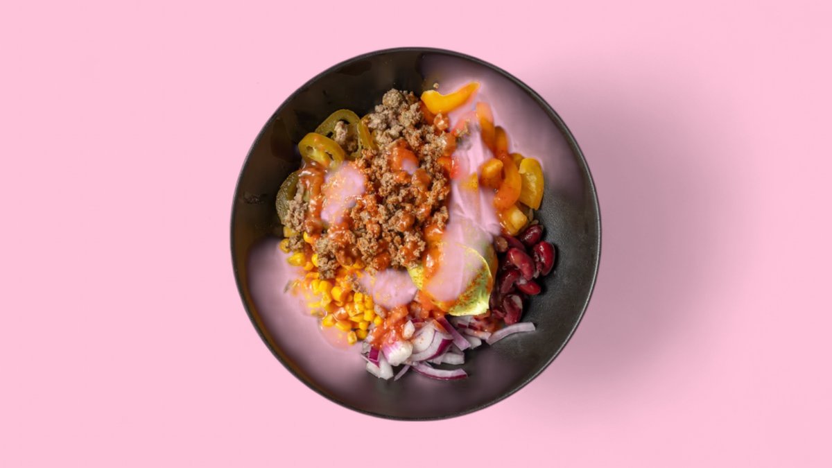 mit gebratenem Rinderhackfleisch, Kidneybohnen, Mais, rote Zwiebeln, Paprika, Jalapeños, Avocadocreme, Spicy Salsa Soße und Chilli Flocken