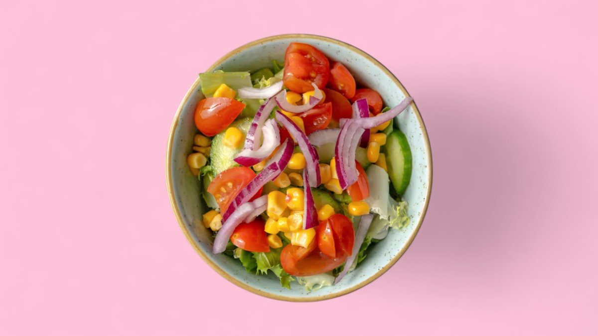 ein kleiner Beilagensalat mit gemischten Salat, Tomaten, Gurken, Mais und Zwiebeln, dazu eine Soßenach Wahl und ein Topping nach Wahl