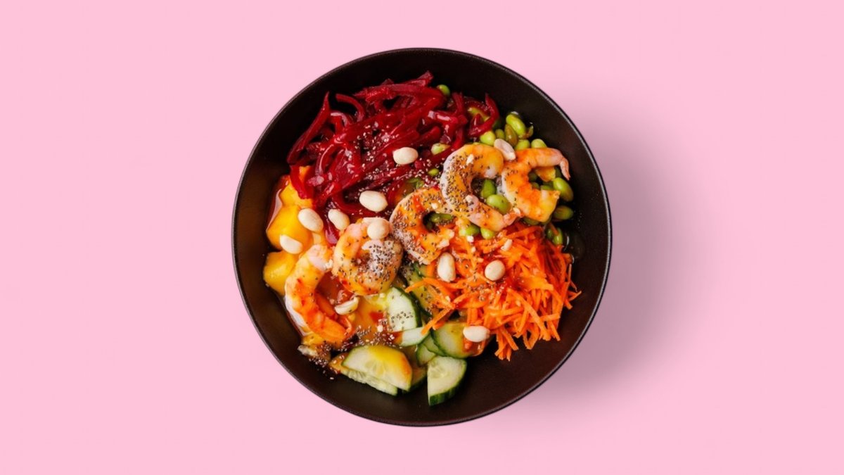 mit Mango, Rote Beete, Karottenstreifen, Gurken, Garnelen, Waikikisoße, Chiasamen, Erdnusskernen und Thai-Mangosoße
